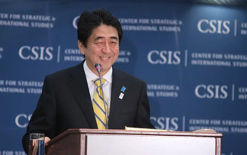 Дядото по майчина линия – Нобусуке Киши, бил наричан „икономически крал“ на окупиран Китай и Манджоу-Го, японска марионетна държава в Северен Китай. След войната американските окупатори го хвърлят в затвора като военнопрестъпник. Освободен е без да има процес срещу него, сформира партия и става премиер на Япония. Дядото по бащина линия – Кан Абе, бил земевладелец от Ямагучи, който служил в Камарата на представителите по време на Втората световна война.