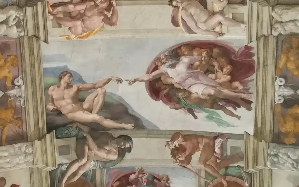 В този шедьовър, рисуван в периода 1508-1512 г., Микеланджело пресъздава библейския разказ за сътворението от книга Битие на първия човек Адам. В него Бог е изобразен като по-възрастен човек със сива коса – този образ е първото вдъхновение за лика му в предстоящите християнски картини.