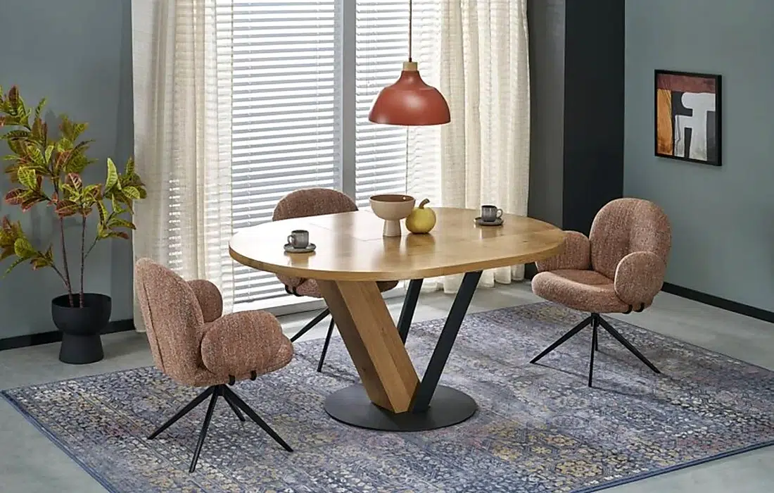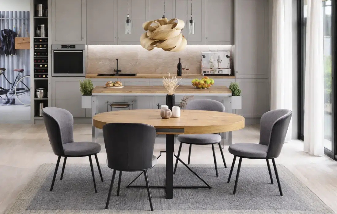 Кръглата форма създава уютна атмосфера и позволява по-естествено. Този модел комбинира естествен дървесен плот с модерна метална основа, което го прави универсален избор за съвременни интериори. Подобни маси са особено подходящи за трапезни зони, които са част от отворено пространство с кухня или дневна.