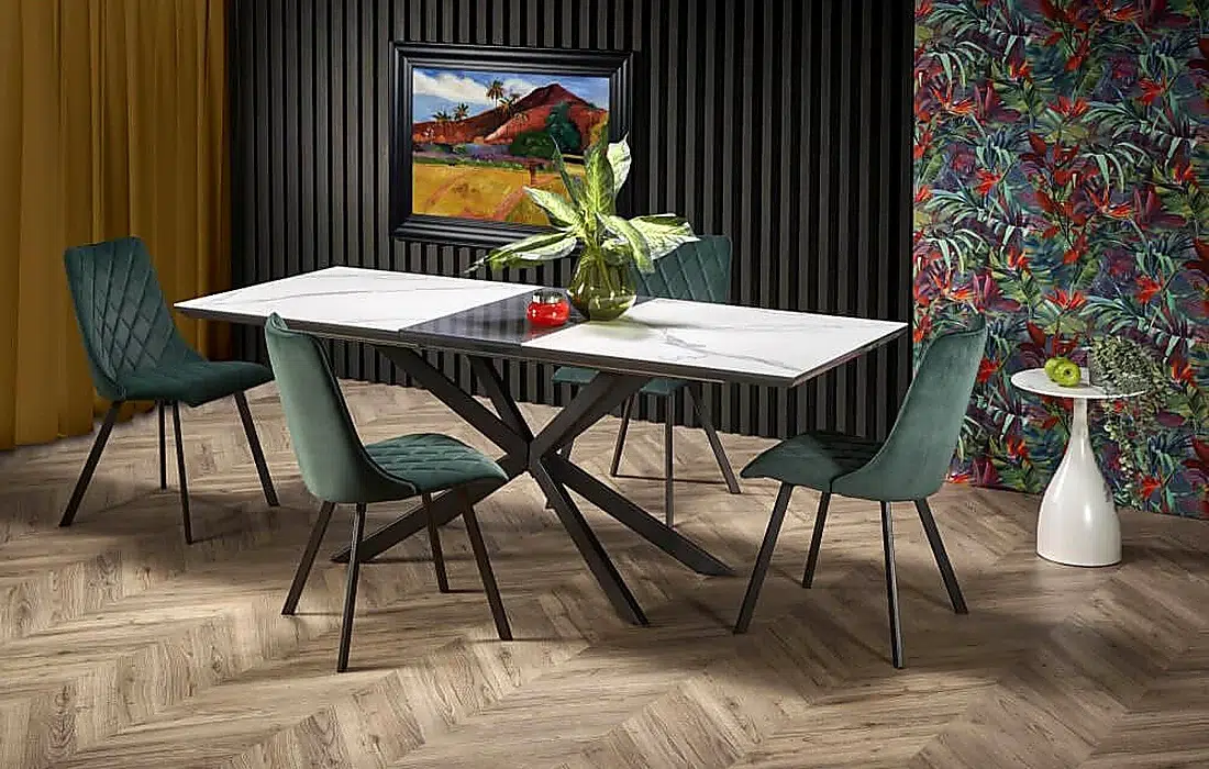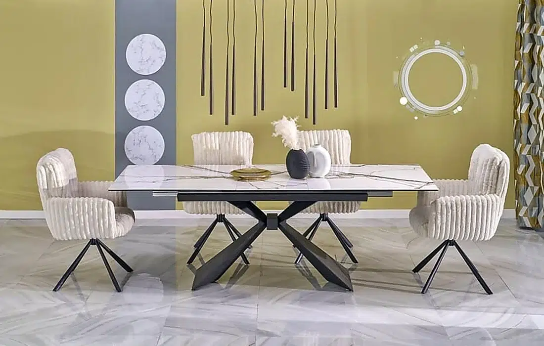 Този модел се откроява с впечатляваща геометрична основа и модерен плот. Подобни маси са предпочитани от хора, които търсят по-силен дизайнерски акцент в трапезната зона.